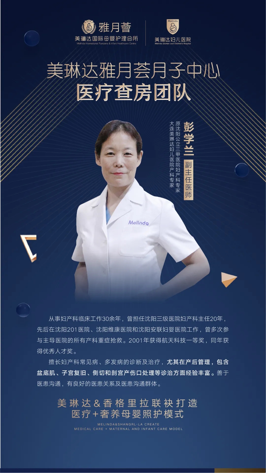 不同于传统月子会所护士查房,美琳达设置产儿乳腺医生多对一每周三次查房巡诊。汇集原沈阳公立三甲医院妇产科医生彭学兰、原大连市儿童医院新生儿科主任尹晶文、原大连市妇幼保健院(妇产医院)乳腺门诊主任单喜芹,人均30多年以上临床诊治经验,技术精湛,能够为母婴提供更专业的服务。